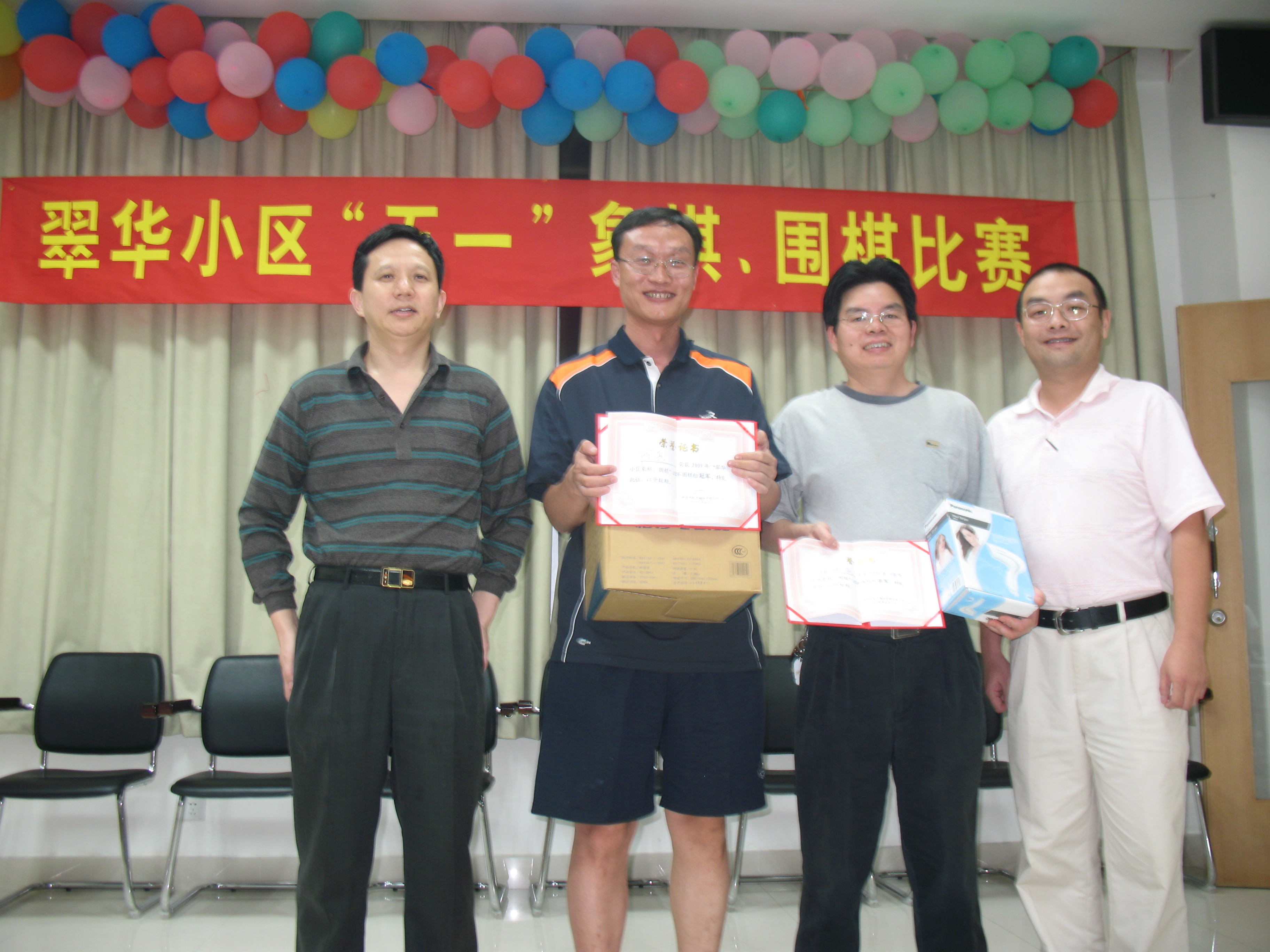 电力物业公司、电力.家和会在2009年5月2日联合举办的“翠华小区象棋、围棋联谊赛”已圆满结束,历经6小时的对弈,参赛嘉宾张浩洋、张国臣、刘子杰获得象棋组前三名;陈兵、张国兵、肖军获得围棋组前三名。在此感谢全体参赛嘉宾对我们工作的支持,并恭贺所有的获奖嘉宾。